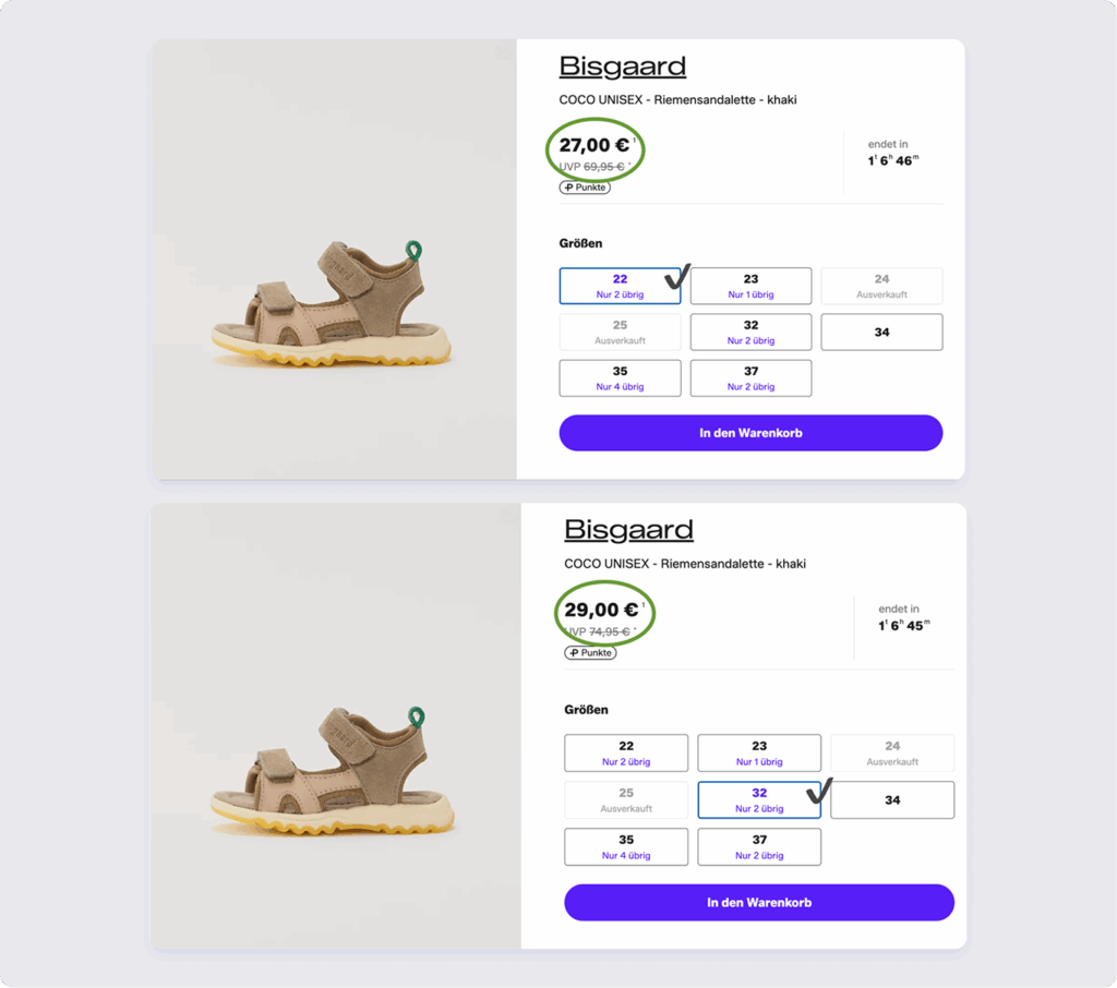 With clear size-based pricing, shoppers see the final price as soon as they select their size. This clarity reduces friction, lowers return rates, and sets better expectations.